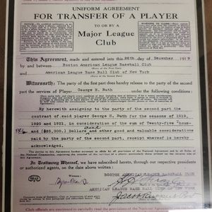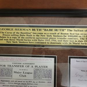 This is a must-have for any Yankees or MLB fan in general. Framed and matted Babe Ruth contract from the Red Sox to the Yankees for a then record $25,000. Dimensions are 20" x 40".