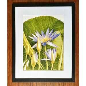 The framed blue water lily botanical picture is a beautifully crafted piece featuring a botanical theme. Matted and framed in a brand new 11" x 14" black frame. Will be carefully packaged for shipping. Ready to hang or gift.