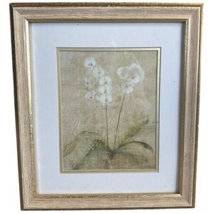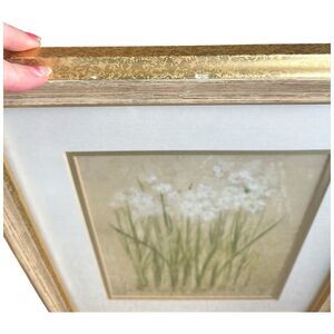 > Set of two vintage-inspired framed botanical prints with gold wood frames and soft neutral tones. Elegant and timeless perfect for farmhouse, cottagecore, or modern traditional spaces. Light wear on frames adds character.