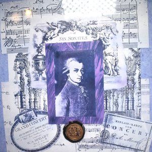 Up for your consideration is a vintage (1990s) framed art piece by artist Linda Jade Charles. It is a mixed media classical music collage print, featuring W.A. Mozart, from her Composer Series line of artworks.