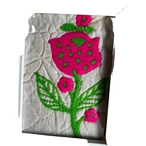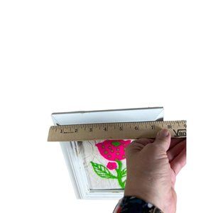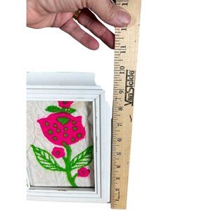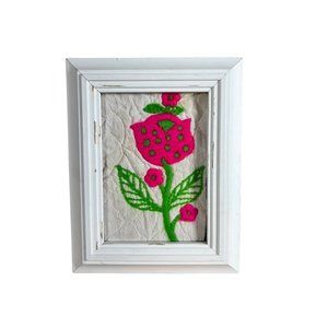 Beautiful pink and green on this crewel quilt that is framed in a retro (but modern) frame with glass.