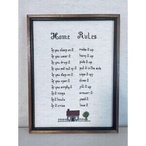 Vintage "Home Rules" cross-stitch wall art from the 1980s, featuring a charming list of household guidelines in classic black lettering, accented with a hand-stitched house and tree motif at the bottom. This framed piece embodies a nostalgic cottage-core aesthetic with a farmhouse vibe, making it perfect for rustic, retro, or traditional home decor. The simple wooden frame enhances its timeless appeal, ideal for entryways, kitchens, or family living spaces.