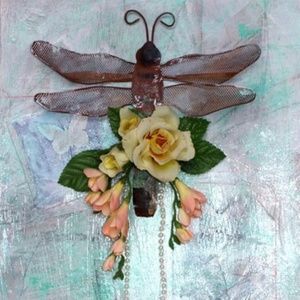 Framed Dragonfly art, mixed media, Vintage Flowers, Pearls, French romantic/cottage/shabby chic/ farm house decor by Kathy Morton Stanion
