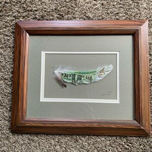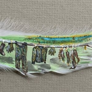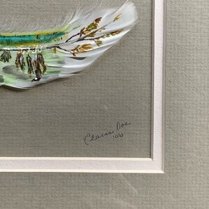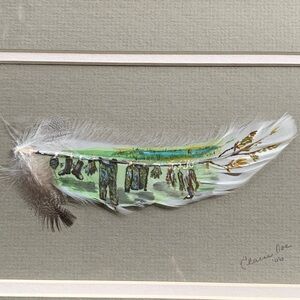 A truly unique and eye-catching piece of art by Elaine Doe, titled “Duck Hunter’s Clothesline”, beautifully painted on an actual feather. This rare medium showcases incredible attention to detail and craftsmanship — a must-have for collectors of wildlife, rustic, or folk art.