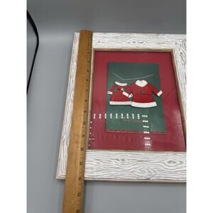 Add festive charm to your holiday décor with this unique framed Christmas wall art featuring Santa and Mrs. Claus felt outfits strung on a line.