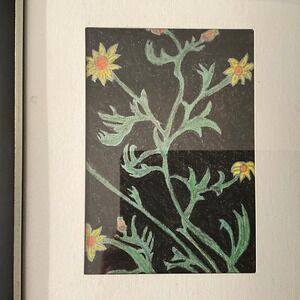 Charming framed floral art print, a delightful addition to any home decor. This captivating piece features a stylized botanical illustration, showcasing vibrant yellow flowers against a dark backdrop. The print is professionally framed with a simple, elegant black frame and a complementing white matting, enhancing its visual appeal.