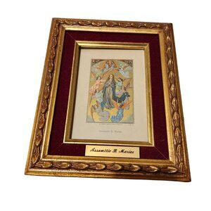 This framed illumination print features a depiction of the Immaculate Conception. The ornate gold leaf frame and rich red velvet matting add timeless elegance.