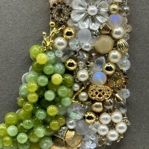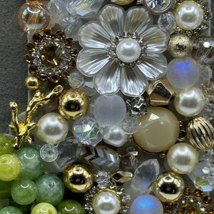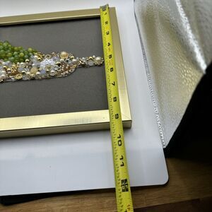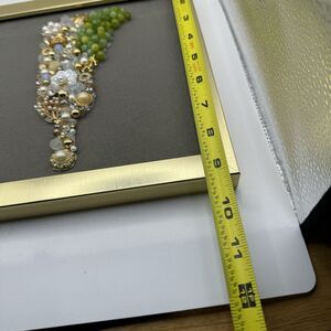 This unique piece of art is a stunning framed jewelry art piece featuring a wine bottle and grapes. The handcrafted piece is one-of-a-kind and showcases a vintage style. The piece is made of wood, velvet, jewelry pieces, and beads, making it a perfect addition to any collection.