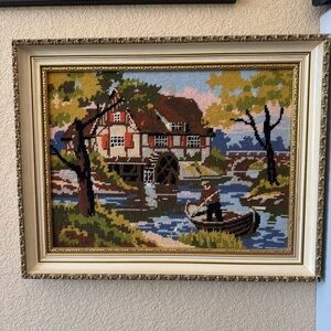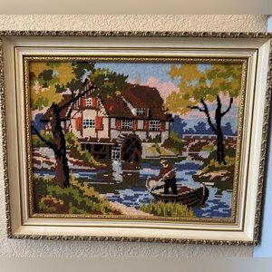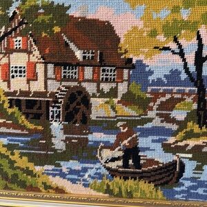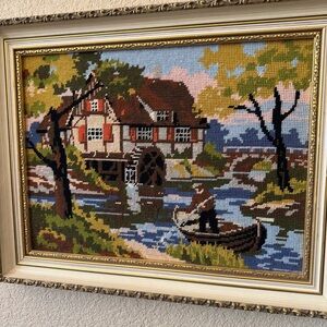 Beautiful framed needlepoint art depicting a scenic landscape with a house, waterwheel a river man in boat.