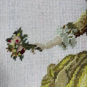 This beautifully framed needlepoint depicts a French country lady with a bouquet, crafted with exquisite detail. Perfect for vintage decor enthusiasts or as a thoughtful gift.