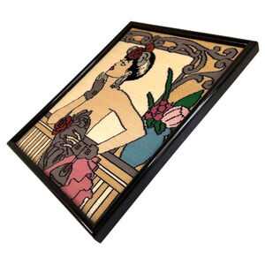 Framed Needlepoint Vintage Embroidery Art Deco Nouveau Flapper Woman Floral Glam