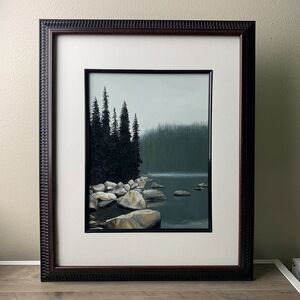 Framed Original Oil Painting Landscape Lake Pines Mist Atmospheric 19x23" Signed