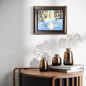 Title: Silvered Light captures a serene winter day along a quiet, icy river, with sunlight shimmering through snow-covered trees. This original painting evokes calm, reflective beauty, perfect for collectors or to elevate any interior space.