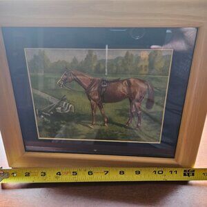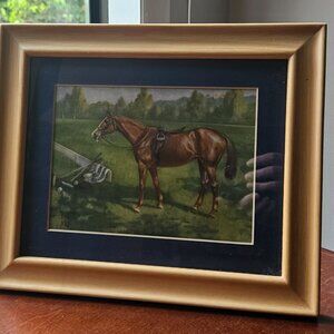 Chestnut sorrel polo pony horse 7.5" wide x 5.5" tall image in 10×12" frame. English tack and saddle.