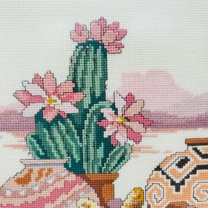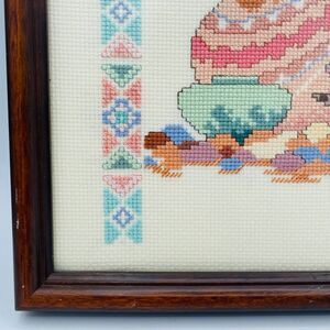 Framed Southwest Desert Motif Themed Cross Stitch Wall Art Cactus Native Pottery