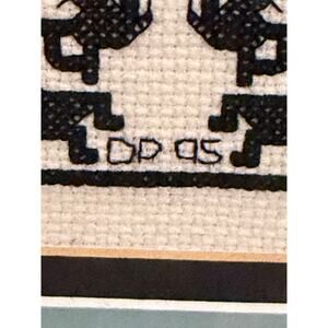 Beautiful handmade cross-stitch artwork featuring three Kokopelli figures against a vibrant desert sunset with mountains, geometric borders, and arrow motifs. Signed “DP 05.” Professionally framed with double matting in teal and charcoal tones. Excellent for Southwestern, Native-style, or boho décor.