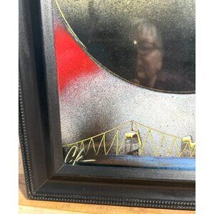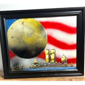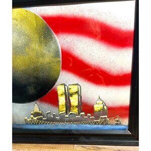 This framed spray-painted artwork captures a stunning depiction of the Twin Towers with an American flag backdrop, symbolizing resilience and patriotism.