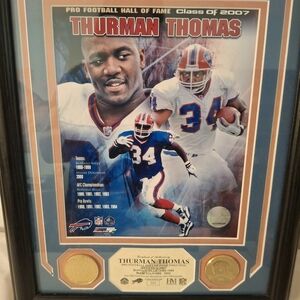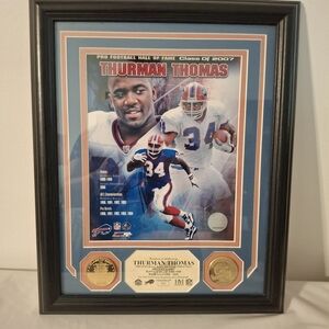 Thurman Thomas 2007 Pro Football Hall of Fame induction framed picture with bronze coins and COA. 10 x 14 picture. Hanging hardware on back. Great condition.