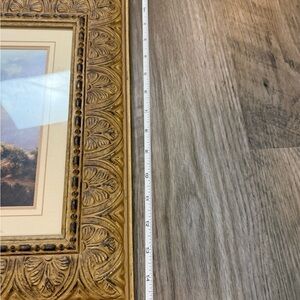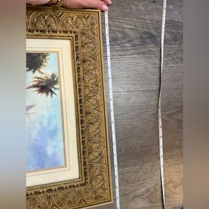 Beautiful framed artwork featuring a sailboat. Tropical scenery with palm trees. Elegant gold frame.