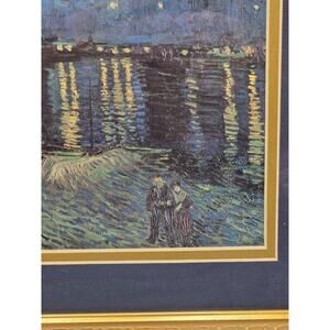 This beautiful framed lithograph of Vincent van Gogh's "Starry Night Over the Rhone" is a must-have for any art lover. The landscape orientation and 11x14 size make it a perfect addition to any room. The lithograph is a licensed reprint and features the famous painter's signature style of Post-Impressionism.