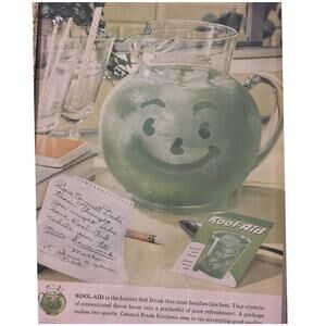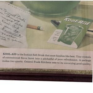 Bring a touch of mid-century charm to your home with this authentic vintage Kool-Aid magazine advertisement, beautifully displayed in a rustic wood frame.