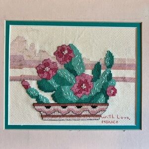 vintage wall art, cactus embroidery, southwest decor, framed cross stitch, desert flower art, pink green needlepoint, retro grandma style, nostalgic home decor, boho cactus art, 90s pastel home, western chic, thrifted gallery wall, handmade textile art, signed vintage needlepoint, rustic framed cactus print, Michaels frame vintage art