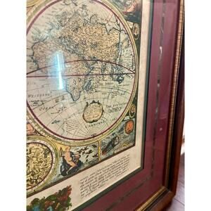 Vintage reproduction framed map print with double-hemisphere design and classical illustrations. Burgundy and marble matting in a wood frame. Measures approx. 21” x 18”. In excellent condition and ready to hang.