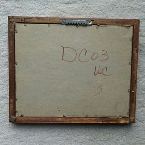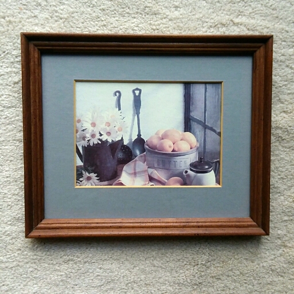 Framed wall art, still life, photography, print in dark brown wood frame with glass and slate blue mat, 11" x 9". Daisies & lemons, cute for the kitchen.
