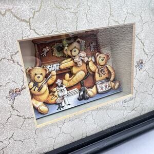 In great shape - adorable piece of handcrafted art perfect for a teddy bear lover or child’s room. Message from artist on back- see photos with rulers for size - hang on wall or sit on shelf