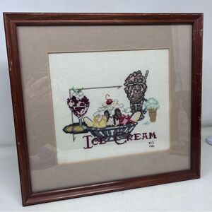 Framed Matted Vintage 1981 Cross stitch Ice Cream Banana Split Sundae 14x13
