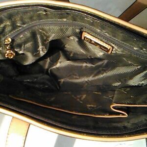 Beautiful classic shoulder bag. Deep brown with a grid created by a subtle signature. Contrasting trim and handles. Top handles zip closure. Interior has a signature fabric with pouches and a zipperd closure. Signature brass plate inside. Feet on bottom. Tiny bit of wear on the handle, not noticable. All pulls are like coins, so pretty! Measures 14×8.5× 3. 10 inch drop from handles. Excellent condition. You will love this classic bag. Old Money Aesthetic.