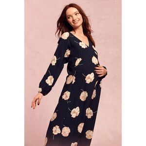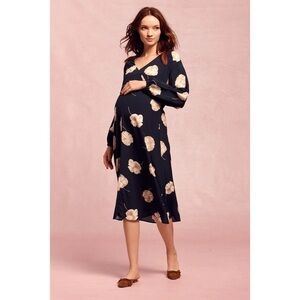Our bias cut v-neck dress in a navy and nude bloom is a hero for the day-to-night wear we’re all looking to achieve. The bias cut perfectly flatters the belly, and the slight raglan drapes perfectly, never too close to the body to feel restrictive.