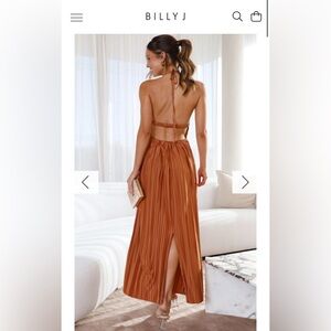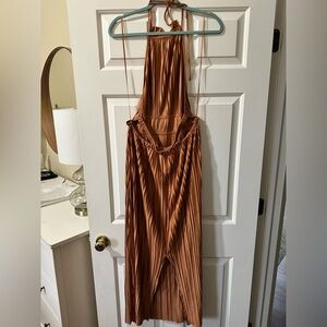 Chic halter neck design. Flowy pleated fabric. Perfect for elegant outings.