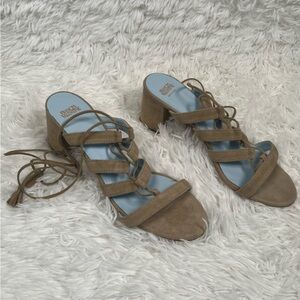 • These sandals feature a stacked heel and a tasseled ankle wrap.