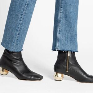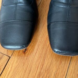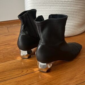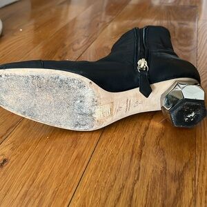 100% leather boots with iconic geometric silver heel. Light scuffing on the toes that can easily be repaired by a cobbler
