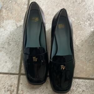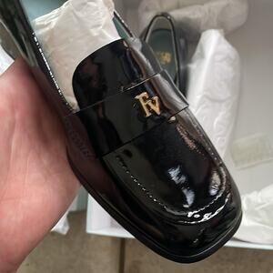 Soft patent leather. Gold FV logo buckle hardware. 2'' block heel. Leather sole.
