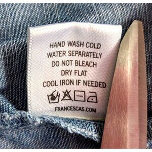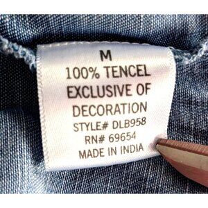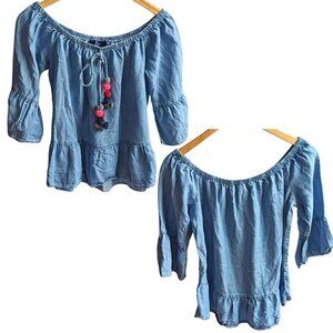 Francesa's BLUE RAIN 100% Tencel Chambray Off-Shoulder Crop Top Boho Poms Size M