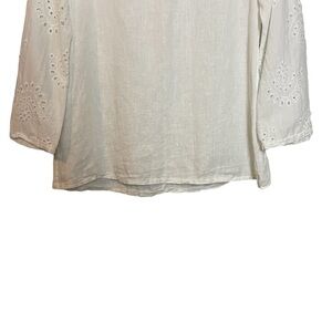 This Francesca Bettini 100% linen eyelet detailed top has eyelet lace detail on the neckline and sleeve. Soft, airy, and cool for the warmer months but can be incorporated in your year round wardrobe as a staple piece. Retailed for $65 Size Small measurements are PTP 20 1/4 length 25” sleeve 20 1/2”