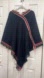 Stylish black poncho with red accents and fringe detailing. Perfect for adding a touch of elegance to any outfit.
