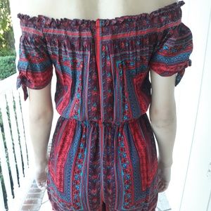 Francesca Multi-Color Romper. Mixed of Wine Red with Bright Orange Red with Turquoise Blue Various Pattern. Tassels around bottom. Stretchy elastic waist. New w/Tags Sz XS