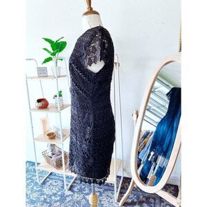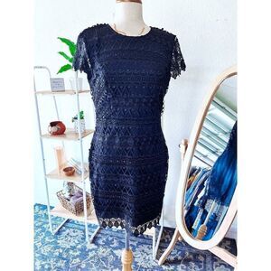 Stunning dress with an intricate embroidered design throughout. Large silver zipper in the back. Thick material. Not sheer. No stretch but fits closely to the body. In excellent condition.