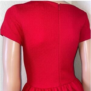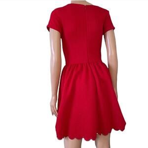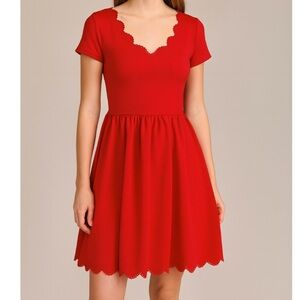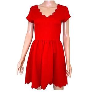 Women’s red dress, size small, scalloped neckline, scallop hem, fit and flare mini dress, short sleeve dress, cocktail party dress, casual red dress, holiday dress, Valentine’s Day outfit, romantic style dress, flirty red dress.