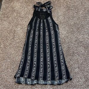 This sleeveless mini dress boasts a stylish halter neckline and a captivating black and white stripe pattern. Its lightweight fabric and gentle A-line shape make it ideal for casual outings or resort wear.