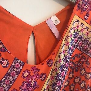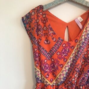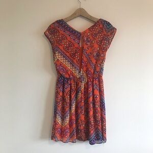 Features: Orange boho floral print mini dress, cinched waist, key hole back.