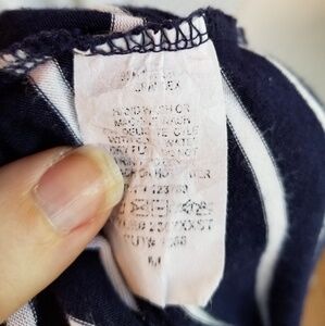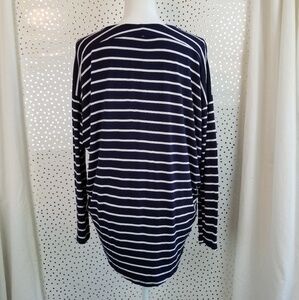 Francesca's Alya blue and white striped criss cross neck top. High-low hem. Super soft. Fabric tag is too faded to tell what it is. Size Medium.