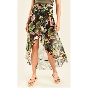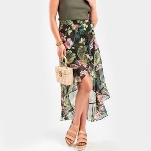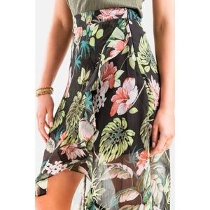 Francesca’s Anna Cai Hawaiian Floral High Low Faux Wrap Skirt Ruffle Black XS