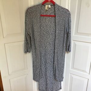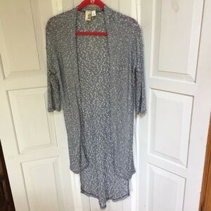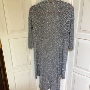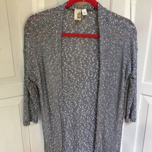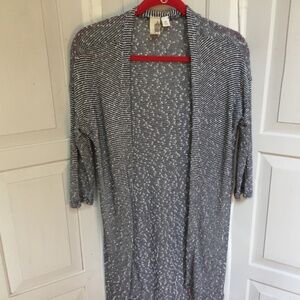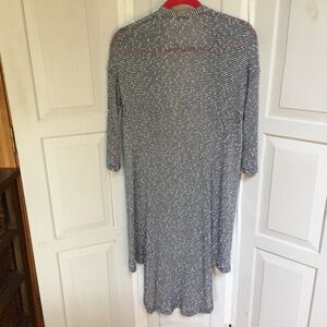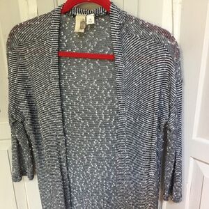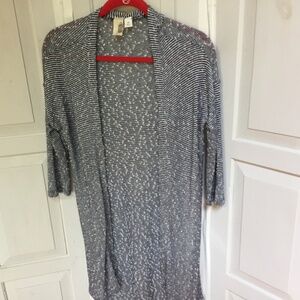 Stylish open-front hi-low cardigan. Features black and white stripes. Perfect for layering. EUC