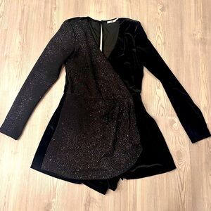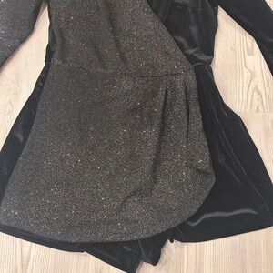 Purchased from Francesca’s. Black velvet romper with silver glitter. Zip back and top keyhole button closure (tiny little clasp above zipper is there but fabric it hooks to is broken- not needed to wear). Only worn once for a winter gala. So fun! Size large.