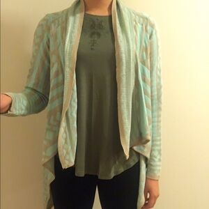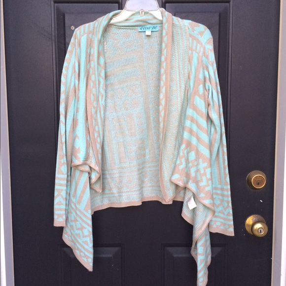 Brand new never been worn. Light blue colored mixed with tan. Aztec like print. Longer on the sides then the front. Slim fitting sleeves. (I)
