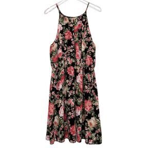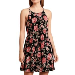 Francesca's Blue Rain Floral Halter Dress. Chic Black and Pink Magnolia Flower Pattern Dress, Halter Neck and Fit and Flare Style Mini Dress. Casual Chic or Formal Dress